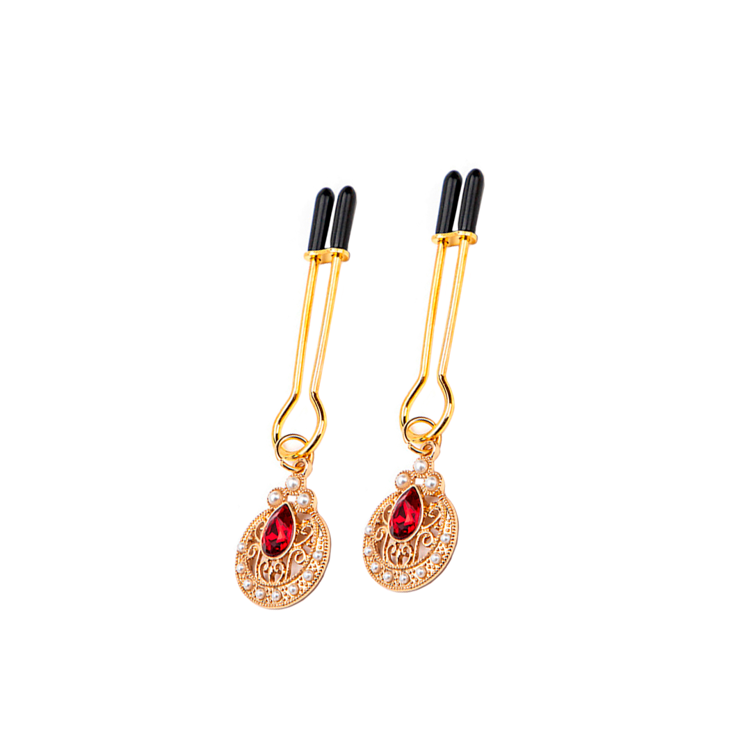 Apresentamos com exclusividade o Grampo de Seios Dourado com Pedra Rubi Vermelha e Pérolas Brancas, uma joia erótica de tirar o fôlego que faz parte da prestigiosa Coleção Segredos.
